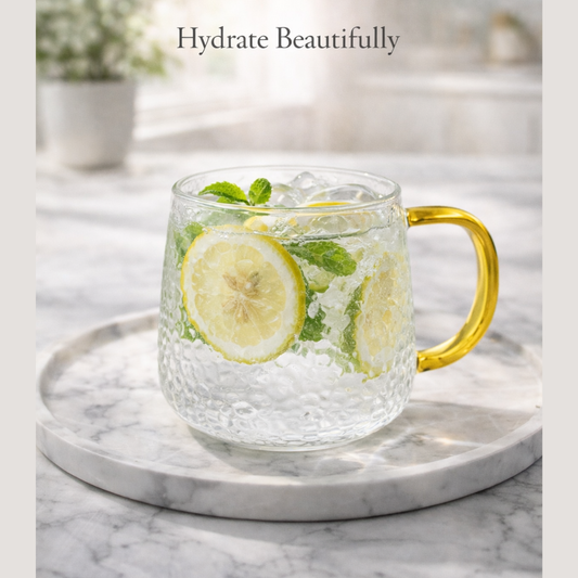 Upgrade your everyday sipping experience with this luxury hammered glass mug featuring a stunning golden handle. Crafted from high-quality crystal-clear glass, this elegant mug adds sophistication to your coffee, tea, lemon water, or herbal drinks. Its textured hammered finish enhances grip while creating a beautiful light reflection effect. Perfect for...