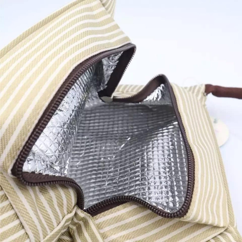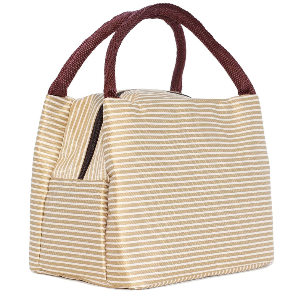 1️⃣ Stylish & Functional Design – Elegant blue striped insulated lunch bag made from durable, washable fabric with a sturdy zipper and handle.